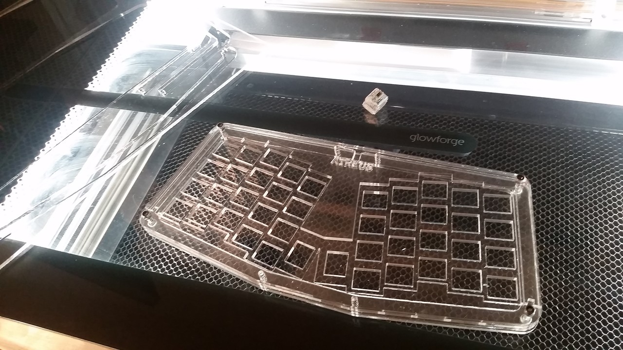 My first serious laser cut on the Glowforge: an acrylic Atreus case. One false start, then turned out great.